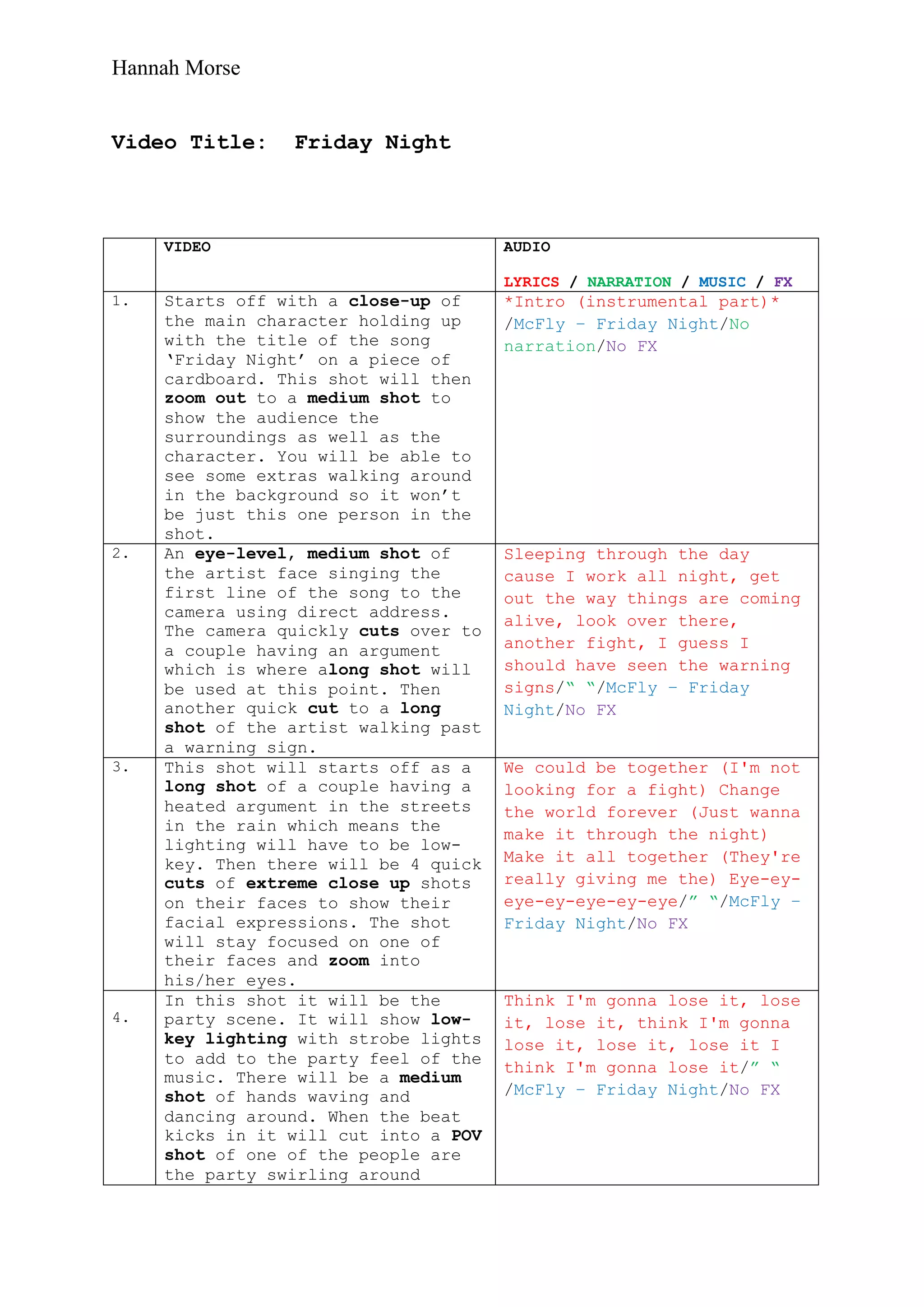 The video is for the song "Friday Night" and contains 13 shots depicting a main character and their experiences over the course of a Friday night. The shots include the character holding up the song title, singing to the camera, witnessing a couple arguing and walking through a park happily later. Additional shots show a lively party with dancing and drinking, the character running through woods and a busy street. The video ends by zooming in on a warning sign as the character and others walk down the street, fading to black with the music.