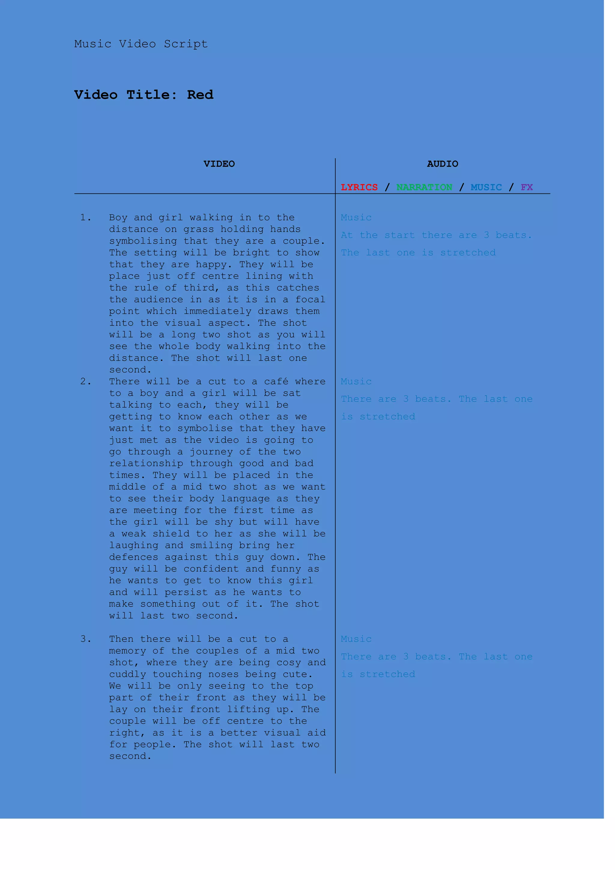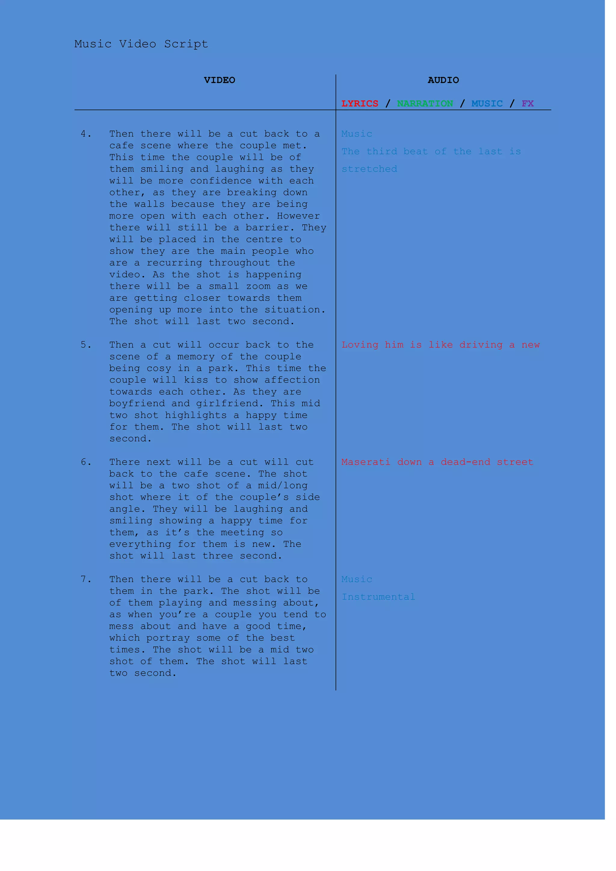 This document is a script for a music video. It provides 35 scenes with descriptions of shots that will make up the music video. The video will tell the story of a relationship from meeting to breaking up through these scenes. It begins with the couple meeting in a cafe and showing happy memories together. It then shows the relationship deteriorating as they argue. Scenes show the girl alone and upset after the breakup. Shots include the couple being happy together in a park and cafe, arguing, and the girl crying over a photo of the two of them after the breakup. The video uses these shots to depict the relationship from beginning to end through the story of the song.