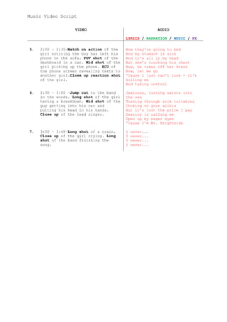 The document is a script for a music video. It details 7 sections of the video totaling 3 minutes and 48 seconds. Each section includes video shots paired with lyrics from the song "Mr. Brightside" by The Killers. The video shows a girl discovering her boyfriend has been unfaithful by finding texts on his phone, then has a emotional breakdown. It also features the band performing in the woods. The video captures the girl's turmoil through intercut scenes with the band and shots of the girl and boyfriend arguing and reacting to the situation.