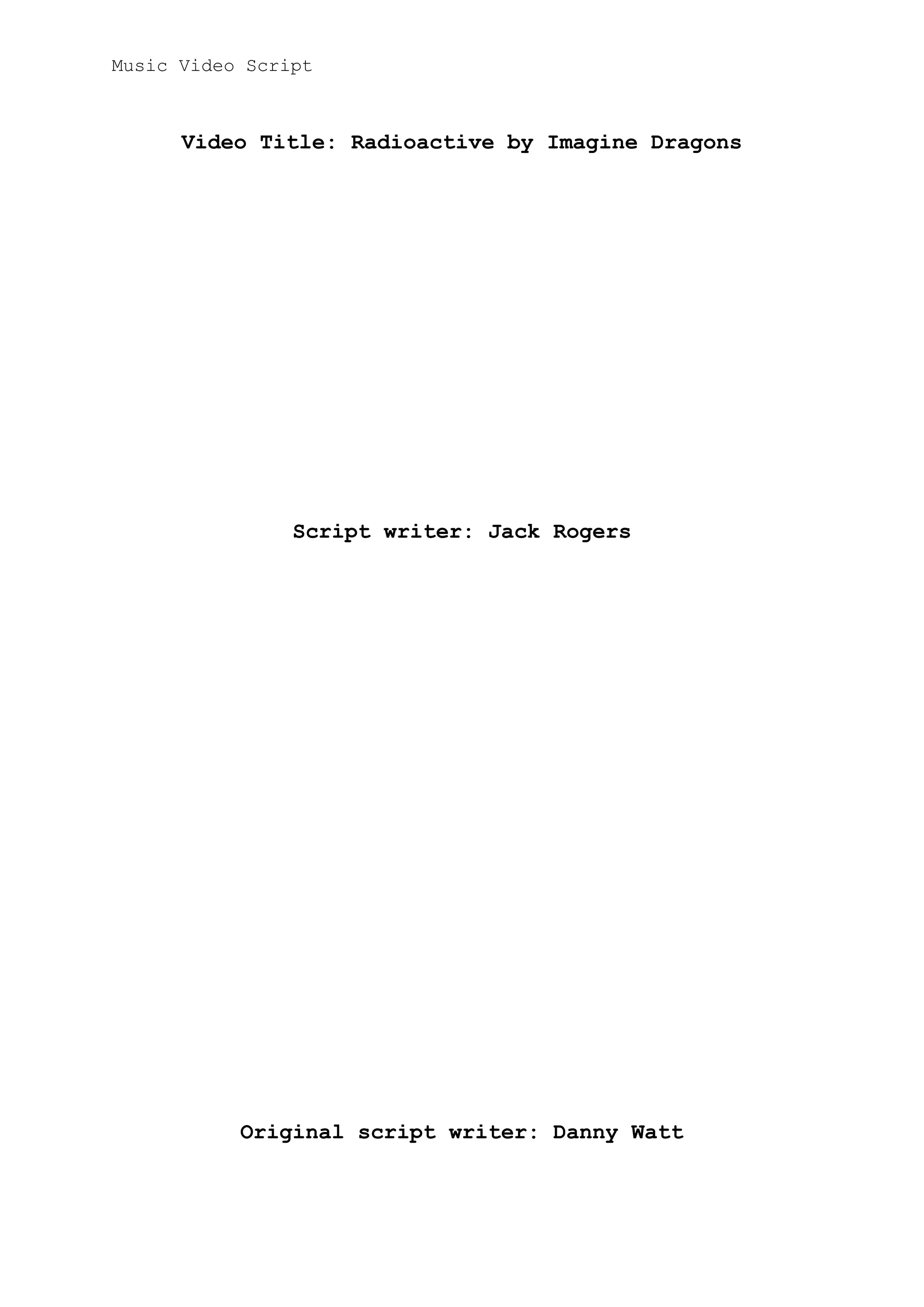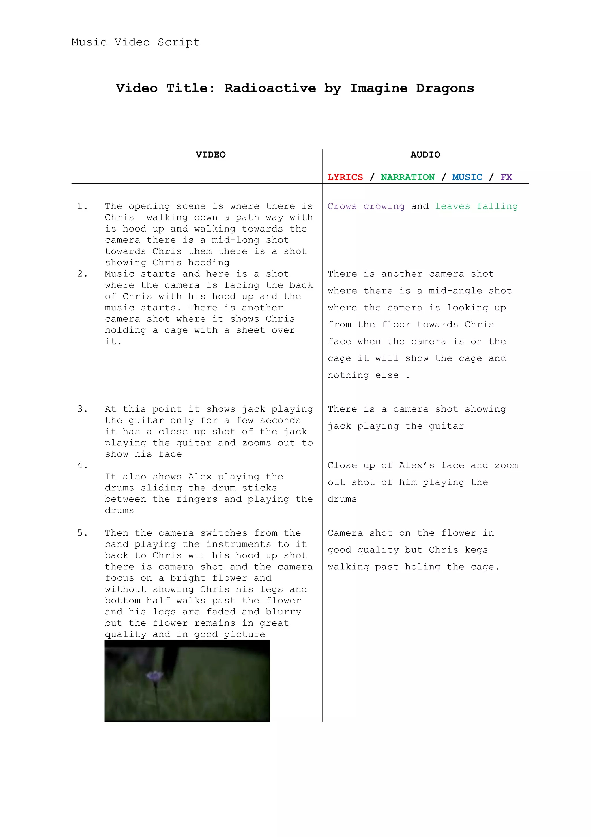 The document provides a script for the music video for the song "Radioactive" by Imagine Dragons. It outlines 30 scenes that alternate between shots of the band members playing their instruments and the lead singer, Chris, walking down a path holding a covered cage. The shots sync up with the lyrics, music, and effects from the song. It provides direction for camera angles, zooms, and the subjects of each shot to depict the story and rhythm of the song through visuals.