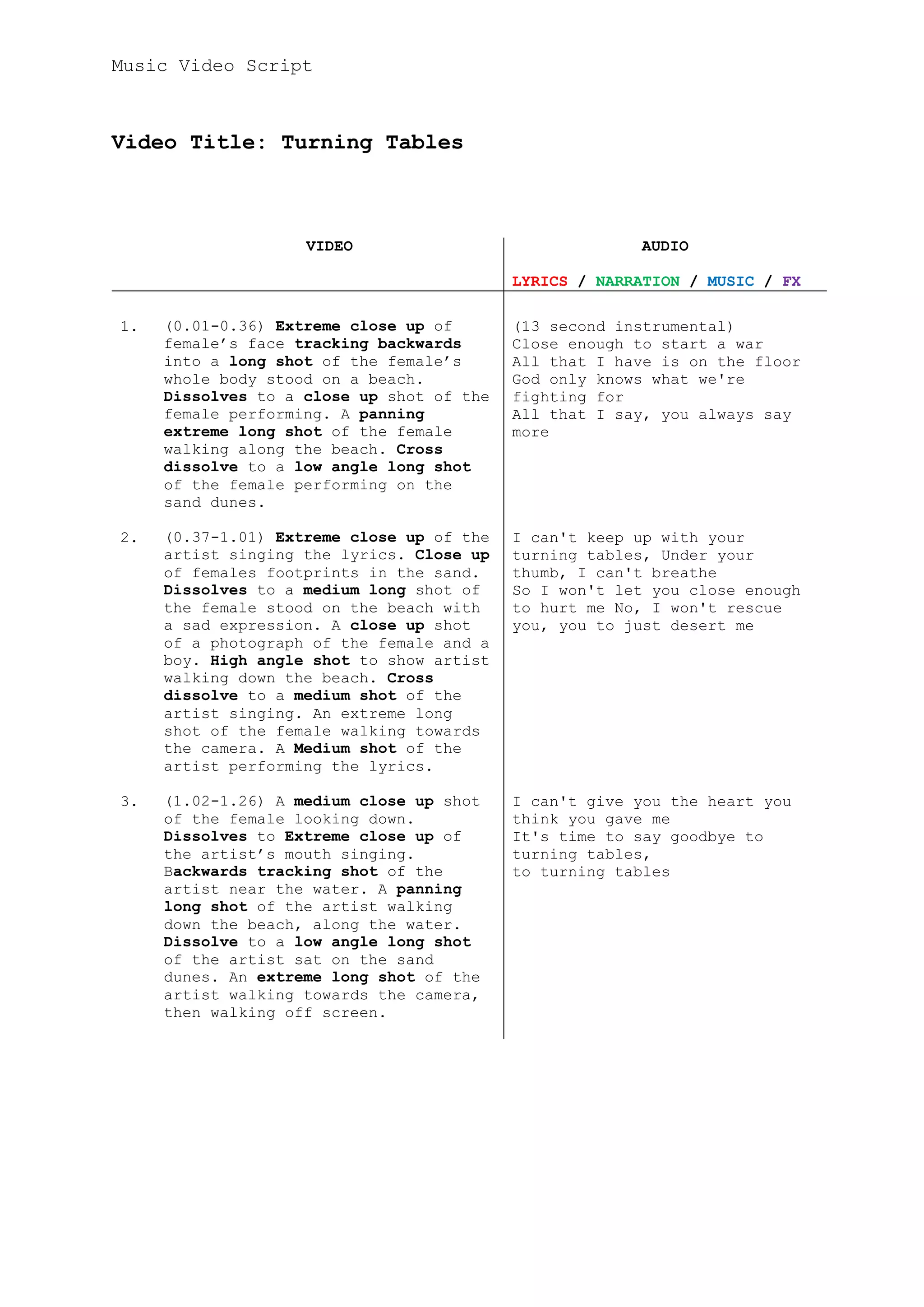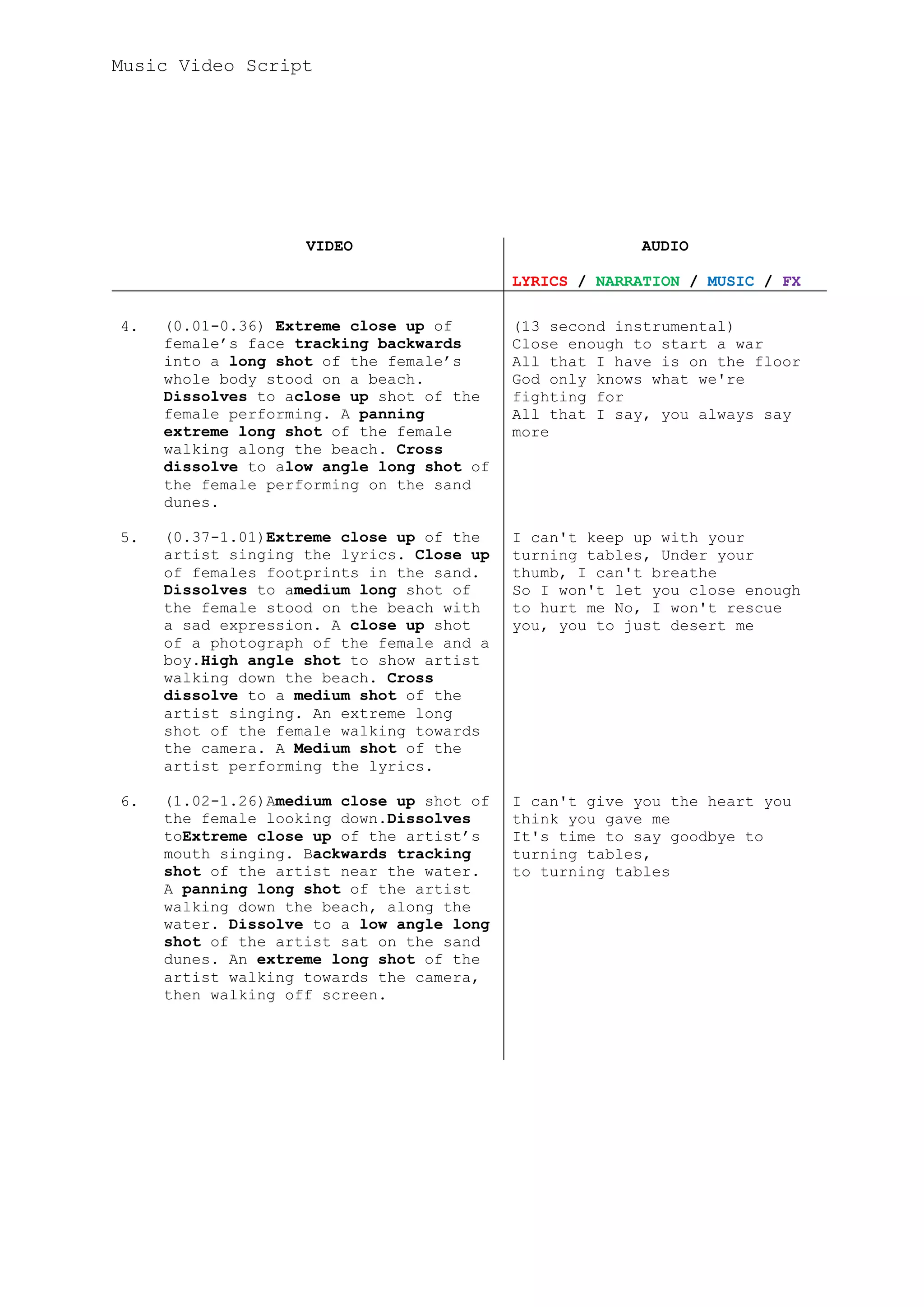 The document is a script for a music video set on a beach. It details 9 scenes showing a female artist singing and walking along the beach, looking at old photographs, drawing and erasing a heart in the sand, and eventually leaving in her car. The scenes showcase the singer expressing sadness over a past relationship through close-ups, long shots and her movements and interactions with the setting.