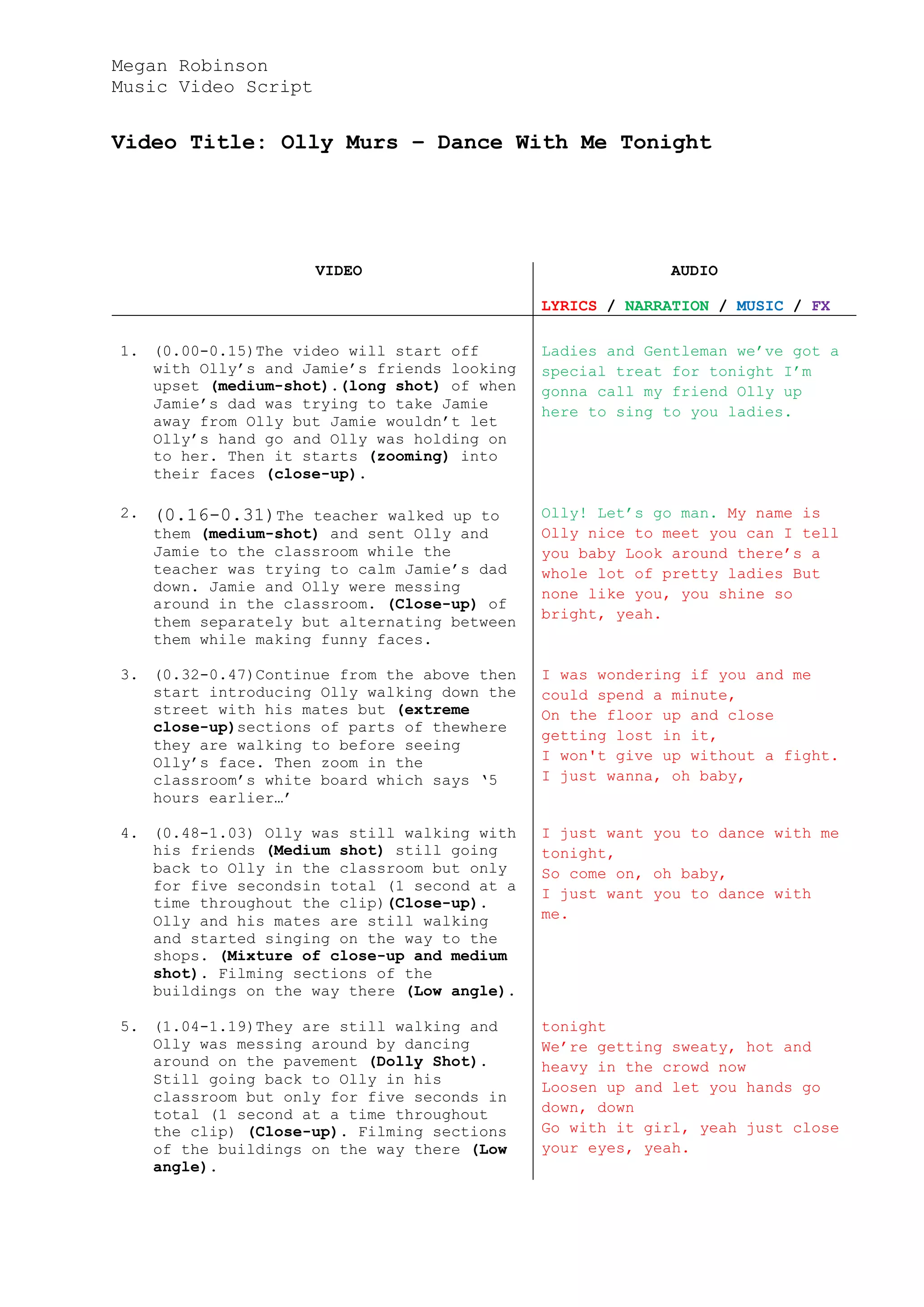 The video script is for Olly Murs' song "Dance With Me Tonight" and contains 13 scenes showing Olly and his friends getting ready for their school prom. It begins with Olly trying to keep his friend Jamie from being taken away by her father. Later scenes show Olly and his friends shopping for suits and shoes for the prom, picking up flowers and decorations, and walking to Jamie's house. They arrive at the prom and dance together before Jamie's father tries to take her home, but in the end he allows her to stay after realizing how happy she is with Olly.