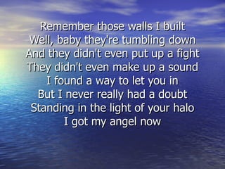 Remember those wallsI built Well, baby they're tumbling down And they didn't even put up a fight They didn't even make up a sound I found a way to let you in But I never really had a doubt Standing in the light of your halo I got my angel now