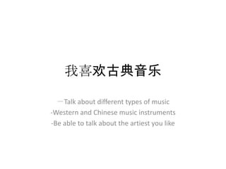 about different types of music -Western and Chinese music instruments -Be able to talk about the artiest you like