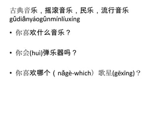 古典音乐,摇滚音乐,民乐,流行音乐 gǔdiǎnyáogǔnmínlíuxíng • 你喜欢什么音乐? • 你会(huì)弹乐器吗? •