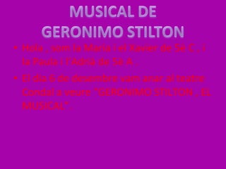 Hola , somla Maria i el Xavier de 5è C , i la Paula i l’Adrià de 5è A . El dia 6 de desembre vam anar al teatre Condal a veure “GERONIMO STILTON , EL MUSICAL”.
