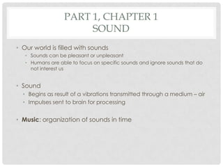 This document discusses the properties of sound and music. It explains that sound is created through vibration, and defines the main properties that characterize musical sounds: pitch, interval, range, dynamics, and tone color. It emphasizes that these properties allow for variety and contrast in music. The document also provides examples of classical and jazz pieces to listen to that demonstrate these concepts, with outlines pointing out notable musical elements to focus on during the listening.