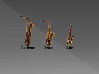 This document provides descriptions of various woodwind, brass, string, and percussion instruments that are commonly found in orchestras and bands. It describes the basic construction and playing technique for instruments in each family such as flute, oboe, clarinet, saxophone, trumpet, trombone, violin, cello, piano, xylophone and drum set.