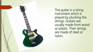 The document discusses several different musical instruments, including the guitar, veena, drums, tabla, flute, and trumpet. The guitar is a string instrument played by plucking strings, usually made of wood or plastic with steel or nylon strings. The veena is a string instrument with seven strings traditionally held by the goddess Saraswati. Drums are percussion instruments played with the hands using drumsticks or hands, and a collection is called a drum kit. The tabla is a specific type of Indian percussion drum invented in India. The flute and trumpet are wind instruments, with the flute played by blowing across the top and the trumpet played by buzzing into the mouthpiece.