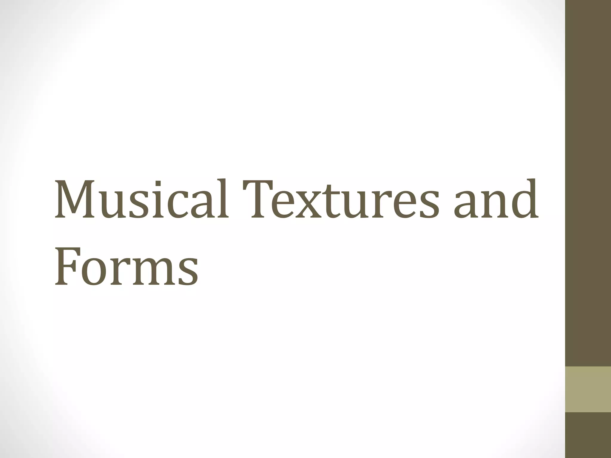 The document discusses various musical textures and forms. It defines texture as the way melodic, rhythmic, and harmonic materials are combined, identifying monophony, homophony, and polyphony. It then explains various musical forms including binary form, ternary form, rondo form, and theme and variations. Examples are provided for each to help illustrate the different musical textures and forms.