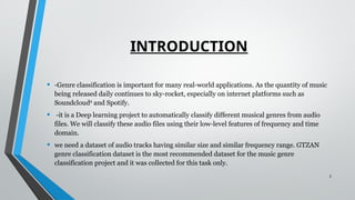 This document outlines a project on music genre classification using deep learning to automate the process of categorizing audio files. It highlights the importance of genre classification for music organization and discovery, details the use of the GTZAN dataset, and discusses the algorithms and challenges faced during implementation. Future applications include developing a music recommendation engine and song identifier app.