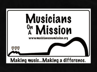 Musicians on a Mission organizes monthly music events to support various local charities, featuring a range of musicians. The events include performances aimed at benefiting causes such as the food bank, homeless veterans, and family services. Opportunities for volunteer involvement in different roles are also highlighted.
