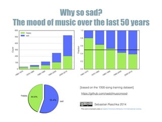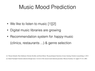The document discusses the development of a machine learning system for automatic music mood prediction based on song lyrics. It covers various predictive modeling techniques, including Naive Bayes classification, feature extraction, and cross-validation methods. Future plans include enhancing mood label lists and comparing different machine learning algorithms for genre prediction and selection.