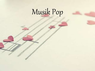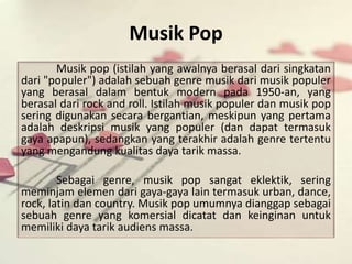 Musik pop, yang berasal dari rock and roll dan muncul pada 1950-an, adalah genre populer yang menggabungkan elemen dari berbagai gaya dan bersifat komersial. Sejarahnya termasuk perkembangan subgenre seperti teen pop, dance pop, dan pop rock, yang mengedepankan melodi sederhana dan lirik yang mudah dicerna. Di Indonesia, musik pop mulai berkembang sejak 1960-an dan dipelopori oleh grup seperti Koes Plus, yang memengaruhi banyak musisi dan subgenre di dalam negeri.