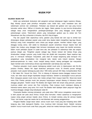Musik pop berkembang dari gerakan seni rupa pop art pada tahun 1960-an. Musik pop dipengaruhi oleh berbagai genre musik seperti rock, jazz, blues, dan memadukannya menjadi musik yang mudah didengar. Musik pop terus berkembang dan menggabungkan unsur-unsur genre baru pada setiap dekadenya.