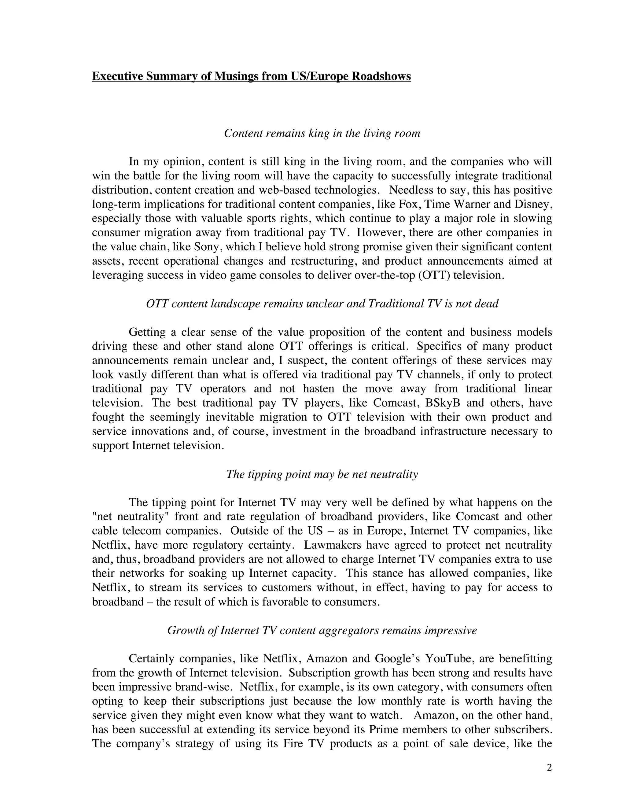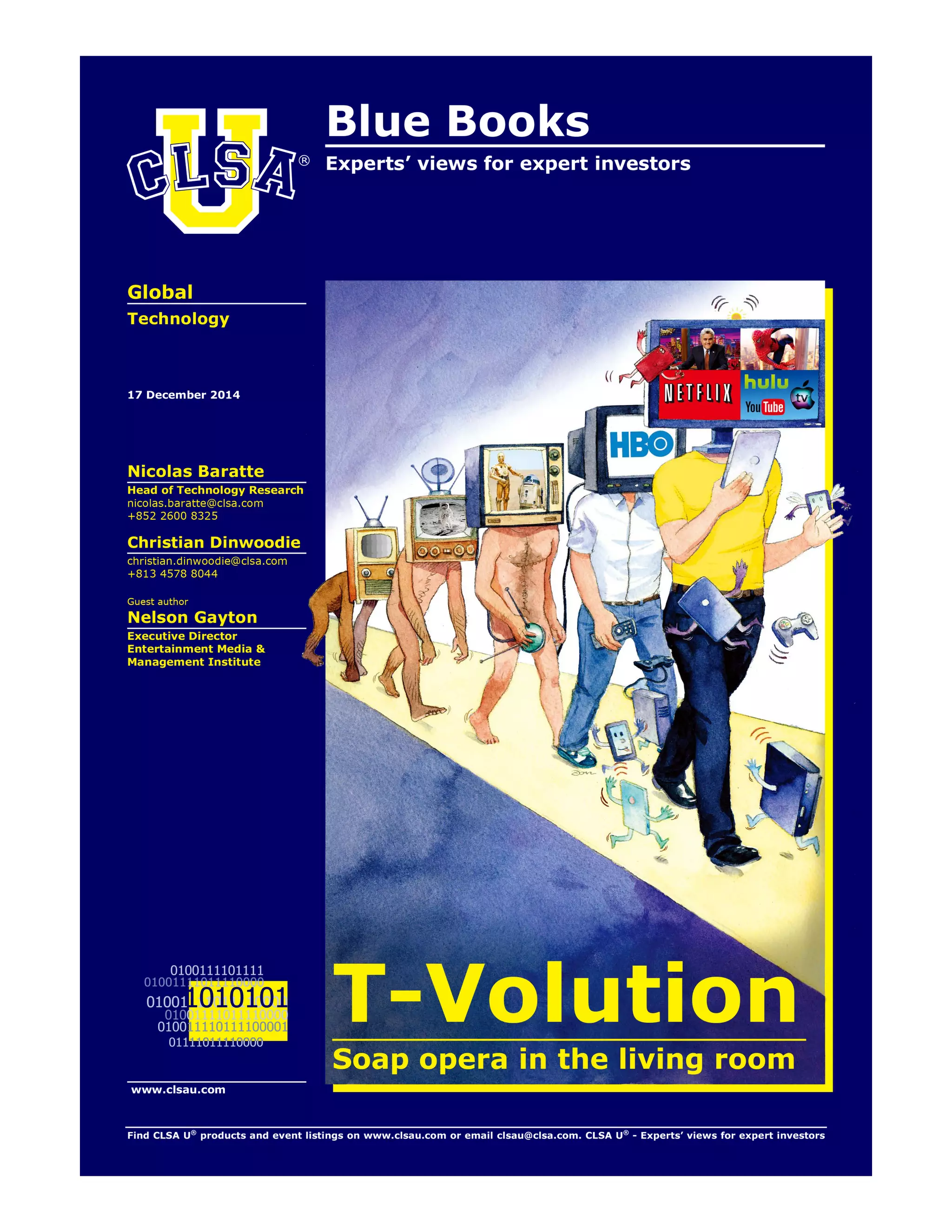 The document discusses the evolving landscape of television and the battle for dominance in the living room. It notes that while content remains important, consumers now control what, when, and how they watch television across various devices. Key players discussed include Google/YouTube which has positioned itself as a major online video platform, Facebook which is pursuing video aggressively and could become the next largest online video property, and Amazon which has integrated video streaming and purchases through its Fire TV platform. The future of television will likely involve various business models co-existing and companies competing to provide content and services that best meet consumer preferences around viewing, searching, sharing, and buying behaviors.