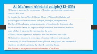 Al-Ma'mun Abbāsid caliph founded the House of Wisdom in Baghdad in 813-833, which became a major center for translating Greek and other ancient texts into Arabic under his patronage. Notable Muslim scientists who made important contributions include Jabir Ibn Hayyan, considered the father of chemistry; Ibn Al Haitham, a mathematician and physicist who made advances in optics; and Ibn Sina, a philosopher and physician whose Canon of Medicine taught for centuries. Other scientists mentioned are Al-Biruni, Ibn Al Naafis, Abbas Ibn Firnas, and Pakistani nuclear scientist Abdul Qadeer Khan.