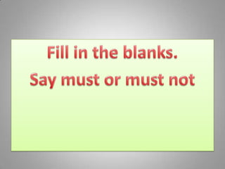 The document provides a list of rules and instructions that use the modal verb "must" or "mustn't" to convey obligations and prohibitions. Some of the rules include studying hard, learning English, listening to the teacher, not smoking, not being late for school, not walking on the grass, being quiet, not making noise, and putting rubbish in the bin.