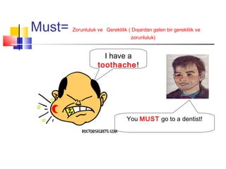 The document discusses the meanings and uses of the words "must" and "mustn't" in English. "Must" expresses obligation or necessity from an external source. Examples are given of sentences using "must" to express things that are required or obligatory. "Mustn't" expresses prohibition. More example sentences are provided using "mustn't" to indicate things that are forbidden or not allowed. Students are given exercises to practice forming sentences using "must" and "mustn't" correctly.