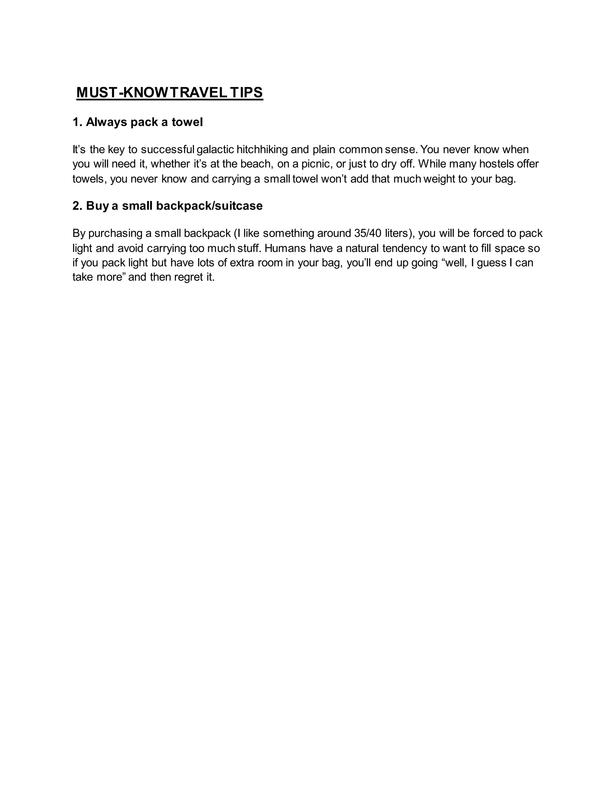 The document provides 5 tips for travel: 1) Always pack a towel for various situations. 2) Buy a small backpack or suitcase to avoid overpacking. 3) Pack lightly by taking half the clothes you think you need. 4) Take extra socks to have clean pairs. 5) Carry extra bank and credit cards in case of loss or theft.
