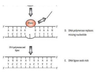 1. Excision repair removes and replaces damaged DNA sections through mechanisms like nucleotide excision repair of thymine dimers, mismatch repair of incorrect bases, and base excision repair of deaminated bases.