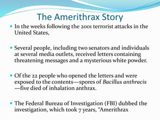 The Amerithrax investigation followed the 2001 anthrax attacks that killed 5 people. Letters containing anthrax spores were sent to media outlets and two senators. The FBI investigation into the source of the anthrax took 7 years.