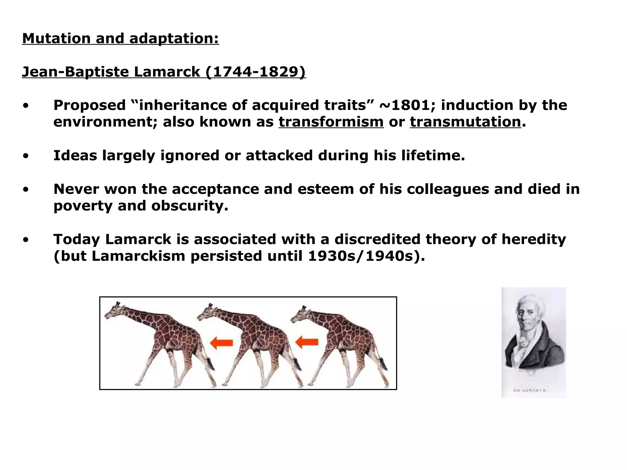 This document summarizes DNA mutation and repair mechanisms. It discusses Lamarck and Darwin's theories of heredity and adaptation. It describes different types of mutations like substitutions, deletions, and frameshifts. Experiments by Luria and Delbrück tested Lamarck and Darwin's theories. The document also discusses DNA repair mechanisms in cells, spontaneous mutations from replication errors, and induced mutations from radiation, chemicals and intercalating agents. The Ames test is described to detect mutagens and carcinogens. Site-specific mutagenesis techniques like PCR can introduce mutations into genes.
