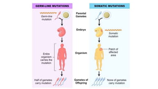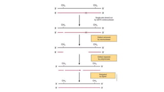 Chapter 7 discusses mutations as changes to genes or chromosomes that can be spontaneous or induced, and the various mechanisms of mutation repair like direct repair, mismatch repair, and more. It further outlines the consequences of mutations on organisms, including neutral, beneficial, and harmful effects, and distinguishes between somatic and germ-line mutations. Chapter 8 details DNA replication processes in prokaryotes and eukaryotes, highlighting the roles of various enzymes and the semi-conservative nature of replication.