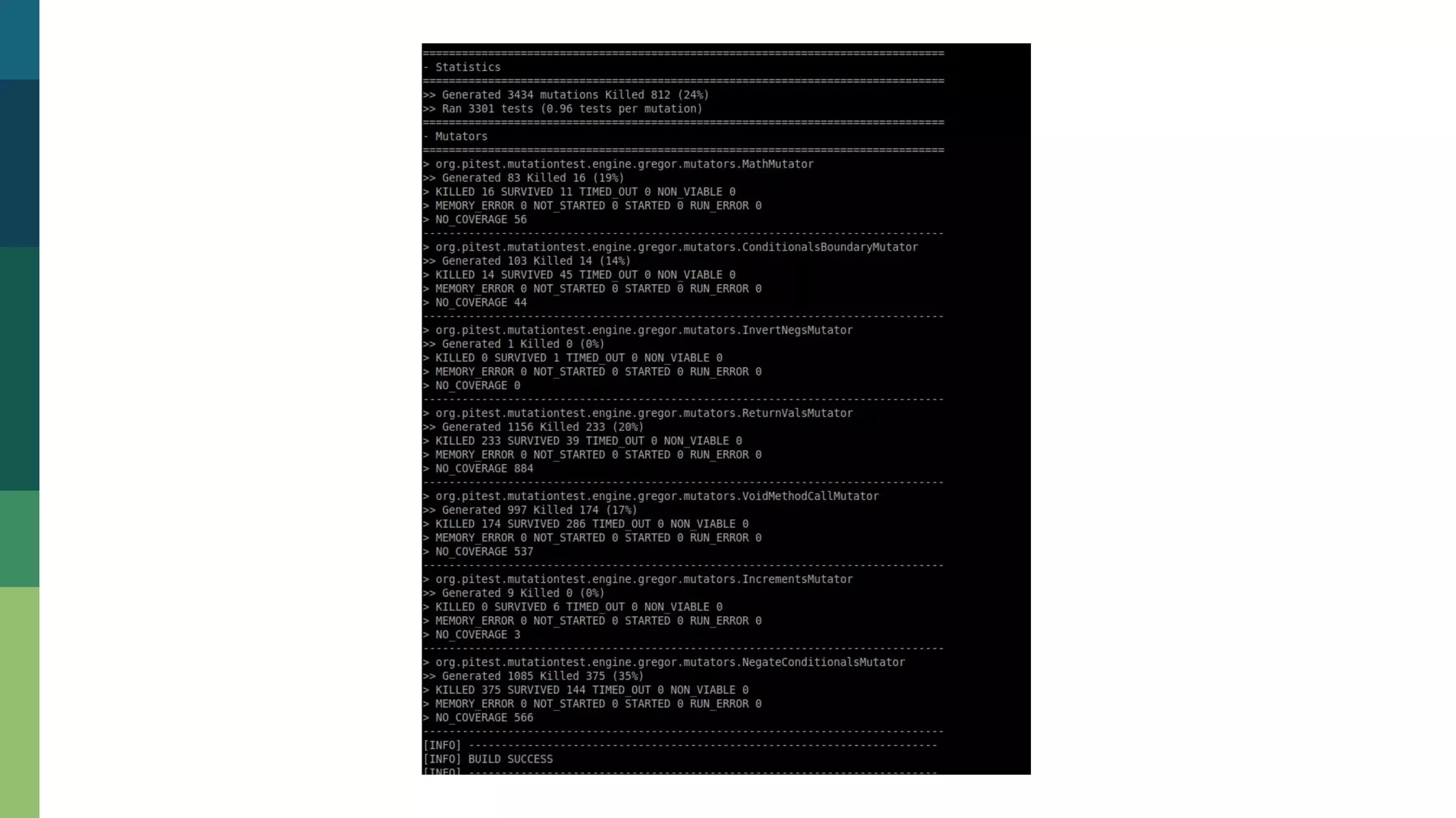Overview of mutators run by Pitest, including examples like INCREMENTS_MUTATOR and CONDITIONALS_BOUNDARY_MUTATOR, explaining their functions with examples.