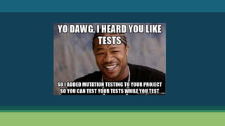 This document provides an overview of mutation testing and the Pitest tool. It defines mutation testing as seeding artificial defects into source code to check if tests detect them. It describes various mutators that Pitest uses to alter code, such as changing relational operators or removing method calls. The document also outlines how to set up Pitest in a Maven project and review the test coverage report. It concludes that mutation testing can find bugs and redundant code but requires significant time to run all mutants. Not all mutants need to be killed to ensure quality.