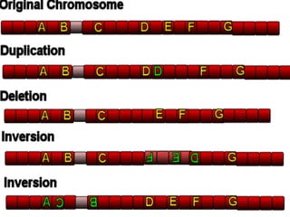 This document discusses different types of mutations that can occur in DNA. It defines mutations as changes in the nucleotide sequence of DNA that can happen either in somatic cells or gametes. There are two main types of mutations: chromosomal mutations, which involve changes to the structure or number of chromosomes, and gene mutations, which are changes to a single gene. Chromosomal mutations include deletions, inversions, translocations, nondisjunction, and duplications. Gene mutations can be point mutations such as substitutions, silent mutations, missense mutations, or nonsense mutations. Frameshift mutations are also a type of gene mutation that change the reading frame of DNA. Mutations can be either harmful if they cause diseases or beneficial if they improve organism