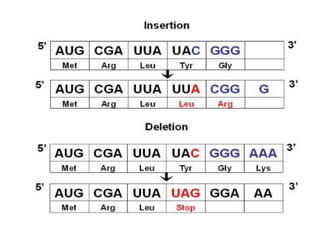Mutations are permanent changes in the DNA sequence that can be caused by errors during DNA replication, environmental factors like radiation and chemicals, or spontaneous changes. Mutations in germ cells can cause inherited diseases while those in somatic cells can lead to cancer. There are several types of mutations, including base substitutions, deletions, insertions, and frameshift mutations. Mutations can have different effects, such as being lethal, silent, beneficial, or carcinogenic by altering regulatory mechanisms and causing uncontrolled cell division.