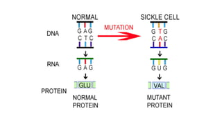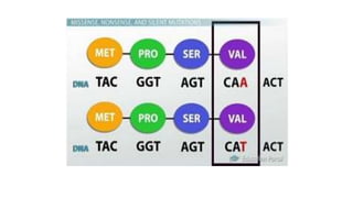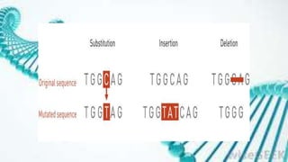 Mutations are changes in DNA sequence that may occur naturally during DNA replication or be caused by mutagens. There are two types of mutations: somatic mutations, which occur in somatic cells and are not inherited, and germline mutations, which occur in gametes and are passed to offspring. Mutations can be caused by physical mutagens like radiation or chemical mutagens like mustard gas. Chromosomal mutations include deletions, inversions, translocations, duplications, and aneuploidy. Gene mutations include frameshift, substitution, insertion, and deletion mutations. Several databases track somatic mutations in cancer genomes, including COSMIC, ICGC, and TCGA.