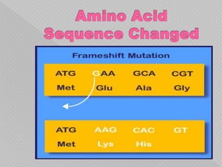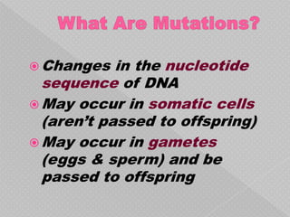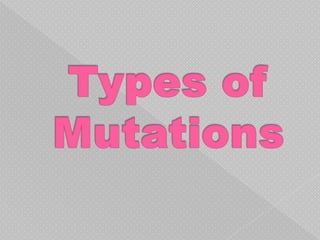 The document discusses different types of mutations that can occur in DNA, including changes in the nucleotide sequence that may happen in somatic or germ cells. Mutations can be caused spontaneously during DNA replication or DNA damage from environmental factors like UV radiation. Types of mutations include point mutations, deletions, inversions, translocations, duplications, and aneuploidy. These genetic changes can have varying effects from being neutral to causing genetic disorders or cancer.