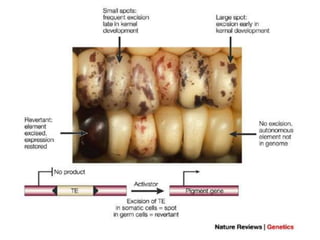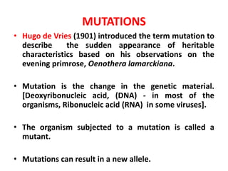 The document discusses mutations, which are changes in genetic material that can lead to heritable characteristics. It categorizes mutations based on their occurrence (somatic and germinal), mode (spontaneous and induced), and nature (chromosomal and gene mutations), detailing their mechanisms and effects. Various mutagens, including physical and chemical agents, as well as specific types of mutations like silent, missense, and nonsense mutations, are described to illustrate their significance in genetic variability and the development of diseases.