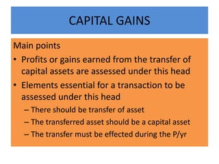 This document summarizes key aspects of capital gains and income tax law in India. It discusses that capital gains are profits from the transfer of capital assets and outlines what qualifies as a capital asset. It then explains the different types of capital assets and how to calculate short-term and long-term capital gains. The document also summarizes the taxation of other sources of income not covered under other heads. It discusses allowable deductions and situations where income may be clubbed or losses can be set off. The overall summary provides an overview of capital gains taxation and other income tax concepts in India.