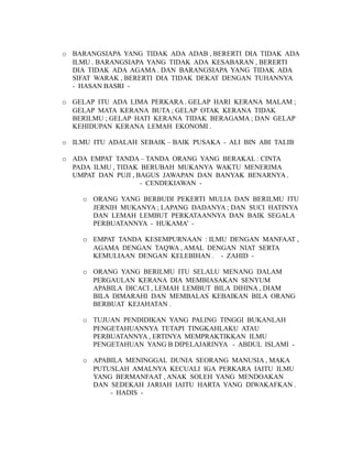 Dokumen tersebut berisi kumpulan mutiara kata dan pesan bijak yang memberikan nasihat tentang pentingnya ilmu, kebaikan akhlak, kesabaran, usaha, dan kepercayaan diri dalam mencapai keberhasilan dan kebahagiaan. Beberapa mutiara kata juga memberikan pesan tentang pentingnya saling menghargai dan membantu sesama.