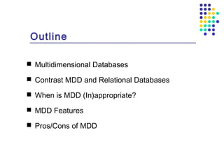 The document discusses multidimensional databases (MDDBs), which are designed to efficiently store and retrieve large volumes of intimately related data from different perspectives called dimensions. MDDBs offer advantages over relational databases for online analytical processing (OLAP) due to their inherent ability to integrate and analyze enterprise data in a way that matches how business users visualize the data. The document outlines features of MDDBs like rotation, ranging, and roll-ups and drill-downs that allow flexible analysis of data across multiple dimensions.