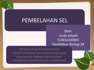 Dokumen tersebut membahas tentang pembelahan sel, terdiri dari pembelahan sel secara langsung pada organisme prokariotik, mitosis yang terdiri dari 5 tahap, dan interfase yang terdiri dari tahap G1, S, dan G2.