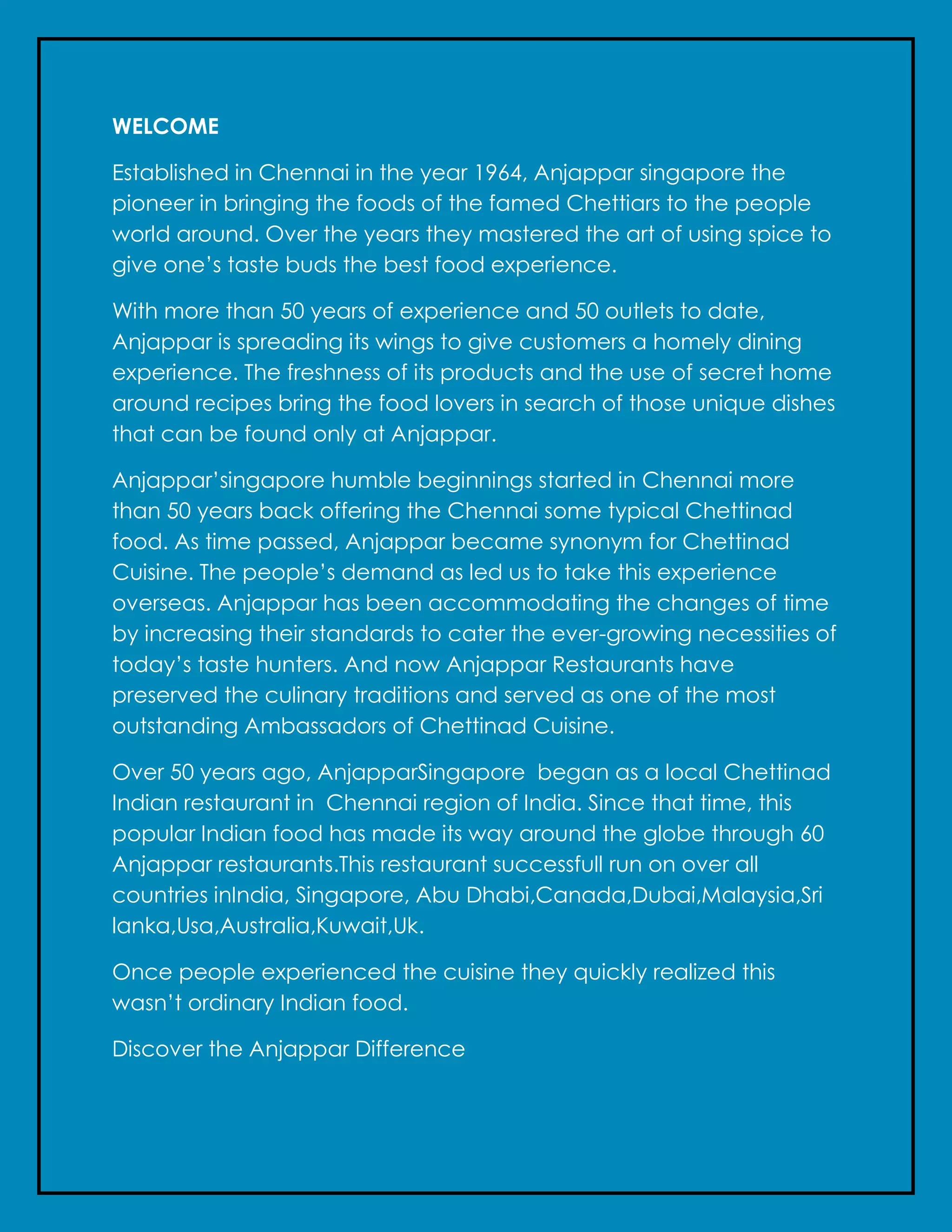 Anjappar, established in Chennai in 1964, is a renowned restaurant chain that specializes in Chettinad cuisine, with over 60 locations worldwide. The restaurant is celebrated for its unique and flavorful dishes, made from secret home recipes and fresh ingredients, which have garnered a loyal following across various countries. Anjappar continues to adapt and preserve its culinary traditions while extending its reach to cater to a global audience seeking authentic Indian food.