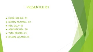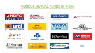This document provides an overview of mutual funds in India. It introduces the presenters and defines mutual funds as vehicles for mobilizing savings that are important for economic growth. It then outlines the history and growth of mutual funds in India in four phases from 1964 to the present. It describes the key structures of open-ended, closed-ended, and interval funds. It also categorizes funds by nature, investment objective, and other schemes. The document discusses the advantages of diversification and professional management as well as the disadvantages of lack of control over costs. Finally, it outlines the roles of the sponsor, trustee, and asset management company in operating mutual funds.