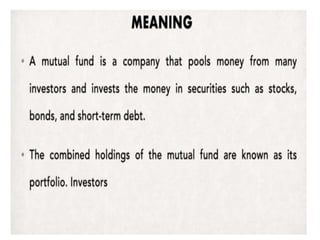 Mutual funds allow investors to pool their money together into a portfolio that is professionally managed. The document discusses different types of mutual funds such as equity funds, bond funds, and balanced funds, which invest in a mix of equity and debt. It also discusses the structure of mutual funds in India, which follows a three-tier model consisting of sponsors, trustees, and asset management companies (AMCs). AMCs manage the day-to-day activities of the mutual fund and charge fees. Overall, the document provides an overview of what mutual funds are, how they work, their benefits, and the different parties involved in mutual funds.