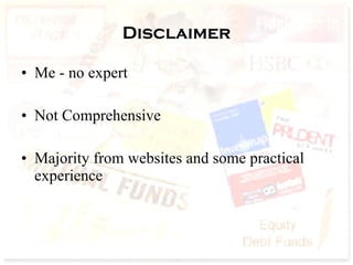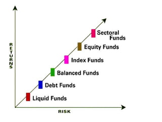 Mutual funds allow investors to pool their money together for investment purposes. The key advantages are professional management, diversification, flexibility, low costs, and transparency. Regulations in India are governed by SEBI and funds are organized as trusts. Terminology includes asset allocation, fund manager, NAV, entry/exit loads, and types of schemes such as equity, debt, balanced, tax saving, and other specialized funds. Investors must consider their goals, risk tolerance, fund performance and costs when selecting funds.