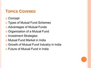 This document provides an overview of mutual funds, including their concept, types, advantages, organization, investment strategies, and growth in India. It discusses key mutual fund topics such as open-ended and closed-ended schemes, growth, income, balanced, and money market funds. The document also summarizes the history and growth of the mutual fund industry in India, from its beginnings in 1964 to recent growth and future prospects, with the industry expected to reach $800 billion by 2022 based on past growth rates.