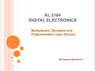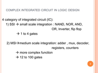 This document discusses complex integrated circuits used in logic design including multiplexers, decoders, and programmable logic devices. It provides details on 4 categories of integrated circuits based on the number of gates - SSI, MSI, LSI, and VLSI. Multiplexers are described as circuits that select one of several data inputs to connect to the output based on the control inputs. Decoders are the inverse, detecting a particular input and activating the corresponding output. Programmable logic devices can be programmed to provide different logic functions, allowing for changes without rewiring the system.