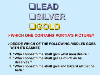 The document outlines a PowerPoint program by Charles Henderson regarding the riddles of the three caskets from 'The Merchant of Venice'. It lists the caskets made of lead, silver, and gold along with corresponding riddles associated with each casket. The riddles challenge the chooser to reflect on the true nature of desire and merit in relation to their choices.