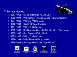 The document provides a photographic history of the m/v Wickersham, detailing its multiple name changes and ownerships from its construction in 1967 as the Stena Britannica to its eventual operation as the Sardegna Bella by 2001. It highlights key historical facts regarding its capacity, routes, and the significance of its namesake, James Wickersham, an important figure in Alaska's political history. Overall, the m/v Wickersham has served various ferry routes in Europe and Alaska, reflecting its maritime legacy.