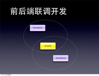 The document discusses the MVC framework and its components. It provides examples of controller and model code for user registration. It also mentions enhancing the front end, working with the WED team, and using MVC, PHP, and templates to separate application concerns and logic from presentation.