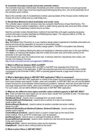 The document outlines key concepts and questions related to ASP.NET MVC, including the request life cycle, the difference between MVC and MVP design patterns, and various features such as areas, return types for controller actions, and action filters. It also discusses enhancements introduced in ASP.NET MVC 3, data annotations for validation, and HTML helpers. This serves as a comprehensive reference for understanding the MVC framework and best practices in application development.