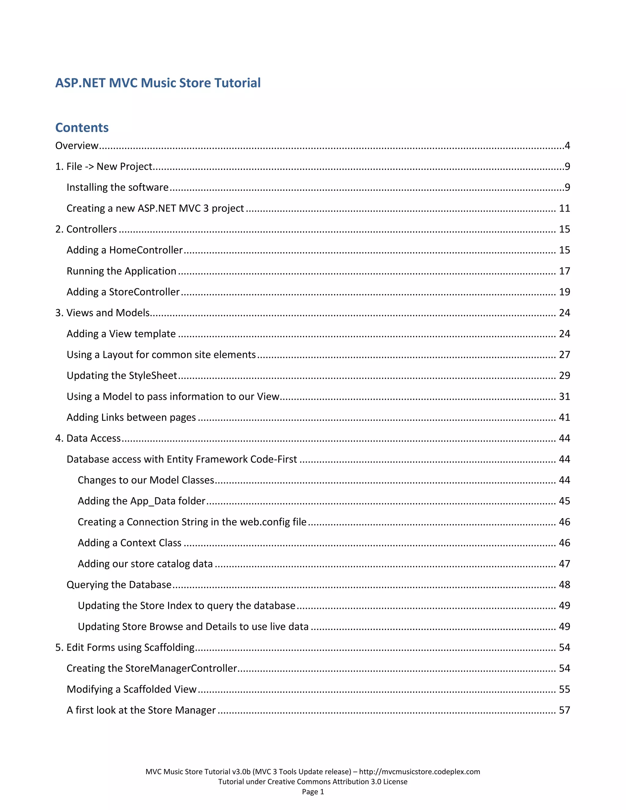 This document provides a tutorial for building an ASP.NET MVC Music Store application. It begins by creating a new ASP.NET MVC 3 project and adding a HomeController to handle the home page. Next, a StoreController is added to manage store browsing functionality, including listing music genres, browsing albums in a genre, and viewing album details. The tutorial then covers data access using Entity Framework Code First, adding validation, membership, a shopping cart, registration and checkout functionality. It concludes by implementing additional site features like navigation, layout updates, and displaying top selling albums on the home page.